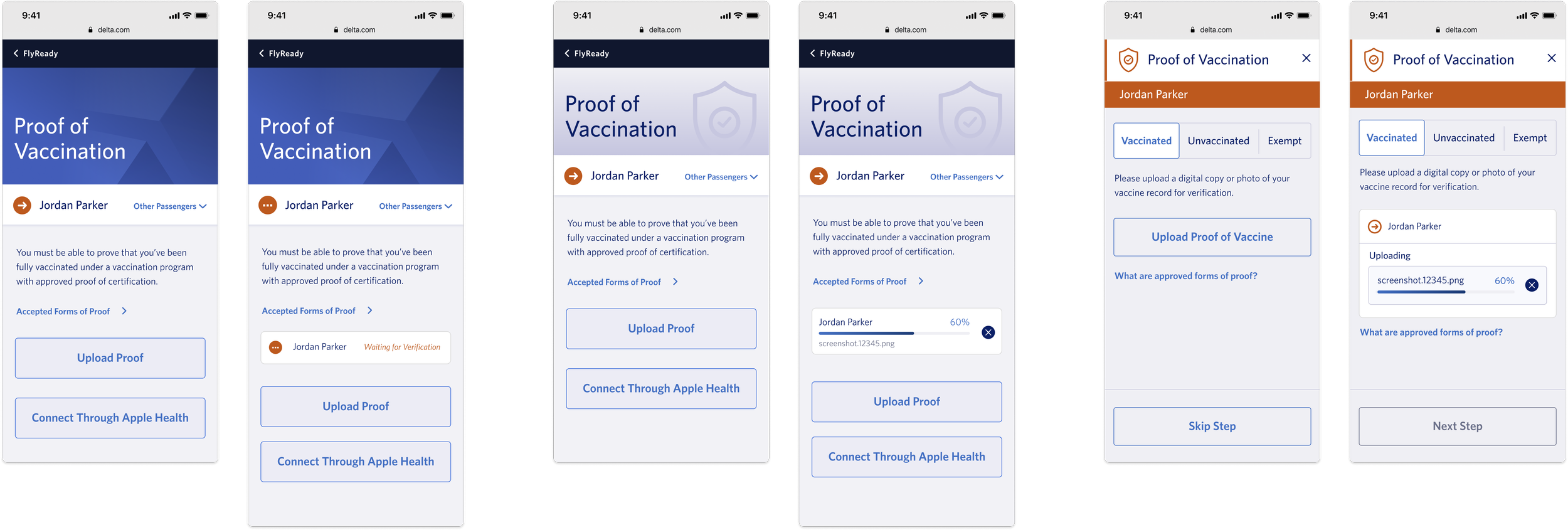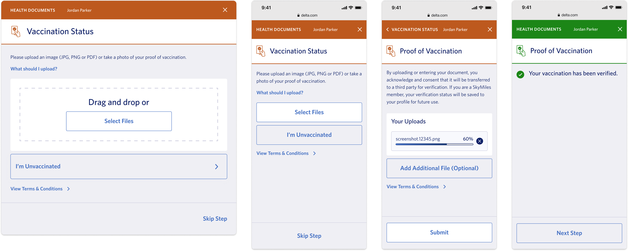 Early iterations were visually very close to the home page designs with the visual hero at the top of the mobile modal with the Delta branding. Users were also given the ability to switch between passengers within the modal so users could upload everyones document at once. For the mobile breakpoints, users were able to upload a document straight from their phone. For health documents we also added a button to connect to Apple Health since users had to ability to connect their vaccination records in there. This would have created an easy one step process for uploading their vaccination information.