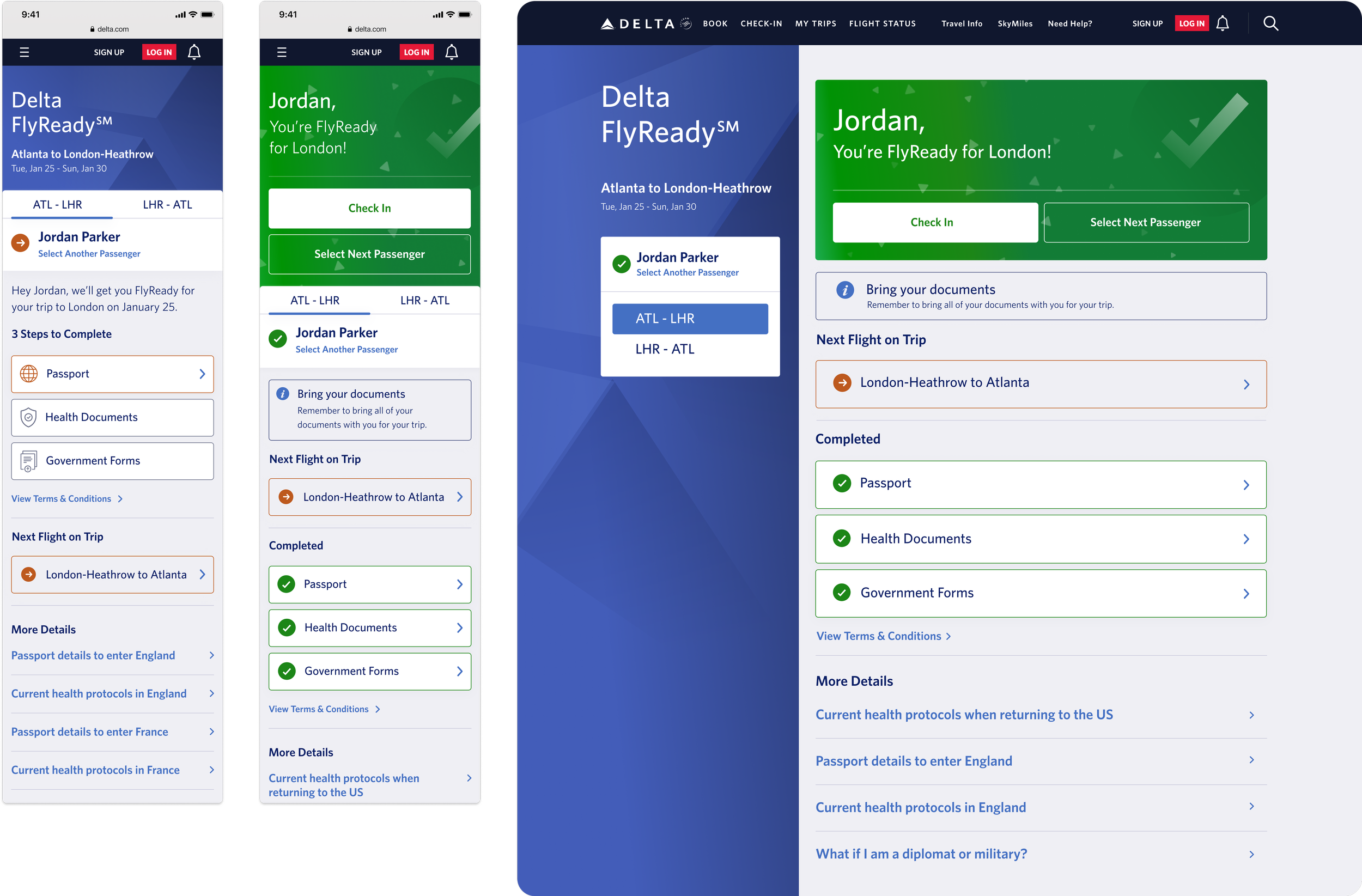 The final designs settled on 3 simplified cards for each step of the process and a visual left rail/top section of the page with more visual Delta branding included. Color & iconography was used to show users which steps users needed to complete and which were completed already. Due to the fact that a user passport was required to compile travel requirements based on the users citizenship, the health documents and government forms cards are disabled until passport information is entered.